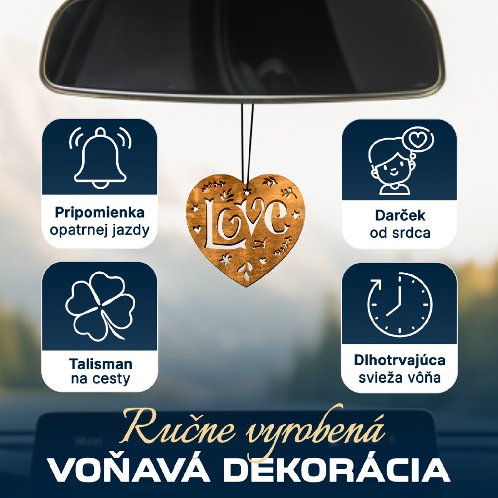 Voňavý talisman do auta ve tvaru srdíčka s vyřezaným nápisem "LOVE" je krásným způsobem, jak dát někomu blízkému najevo, že vám na něm při cestách záleží. Slouží jako jemná výzva k opatrnosti a pokaždé vykouzlí úsměv – jako tiché připomenutí, že láska čeká doma.