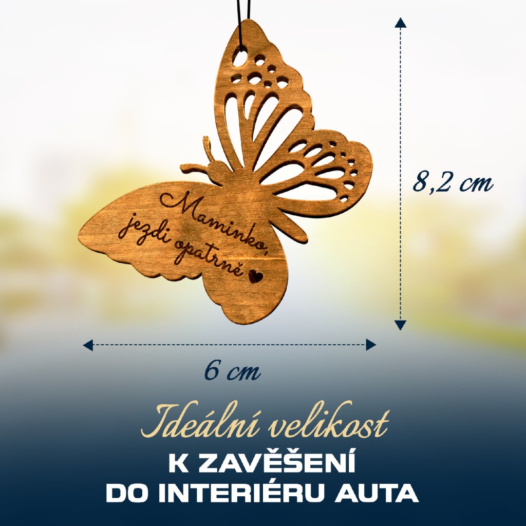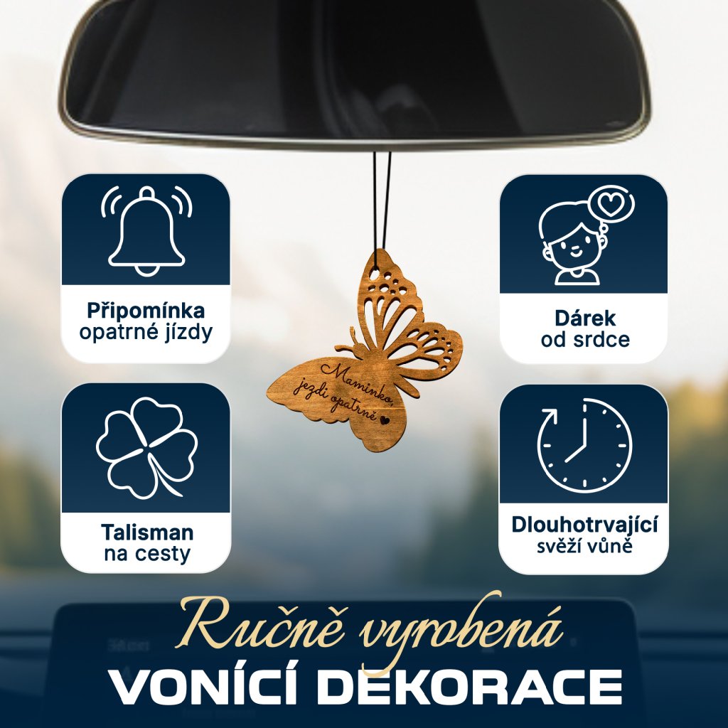 Dřevěná vůně do auta s nápisem „Maminko, jezdi opatrně“ promění každodenní jízdu ve chvíle, kdy si maminka uvědomí, že na ni její děti myslí.