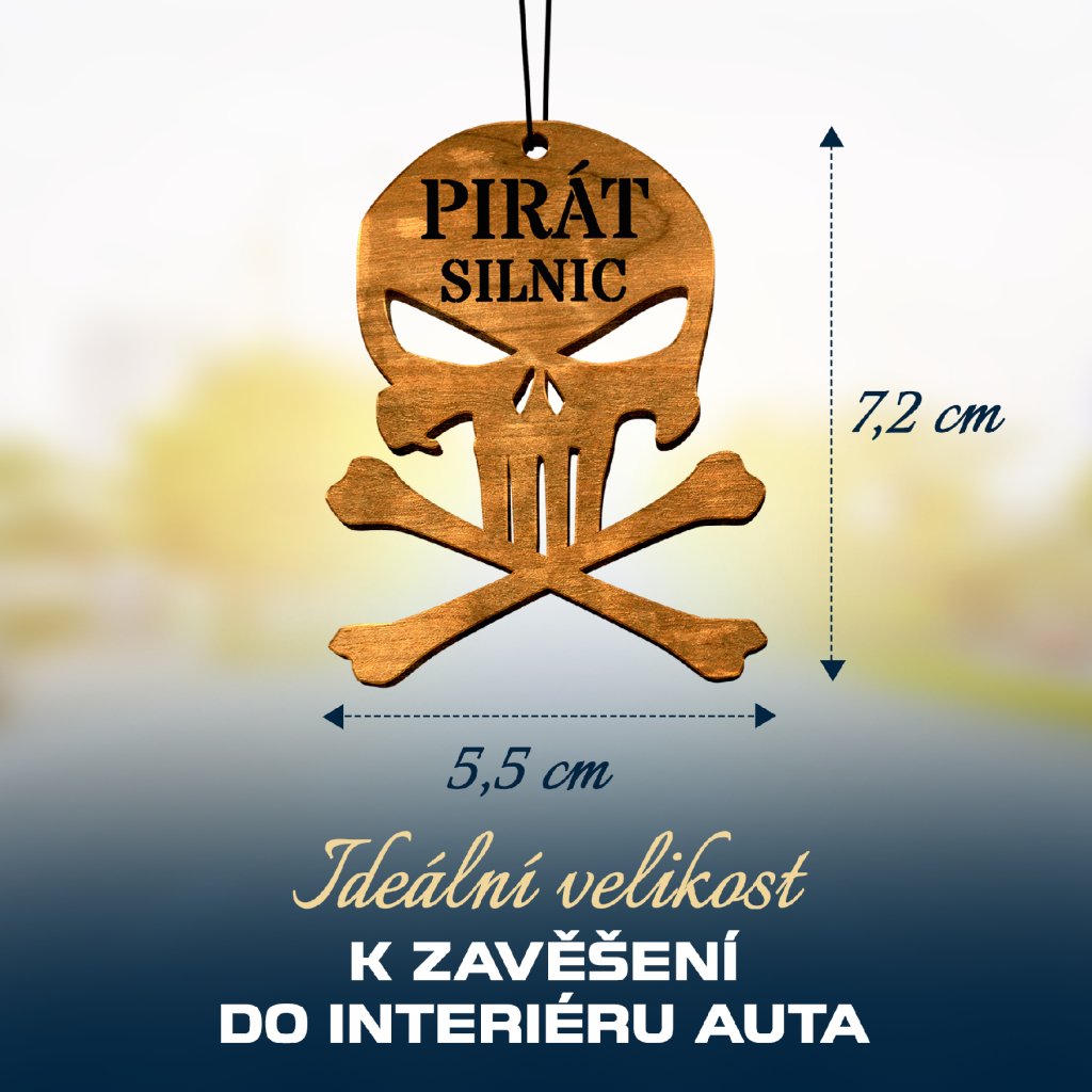 Voňavý talisman do auta ve tvaru lebky se zkříženými hnáty jako vhodný dárek pro někoho, kdo jezdí na plný plyn.