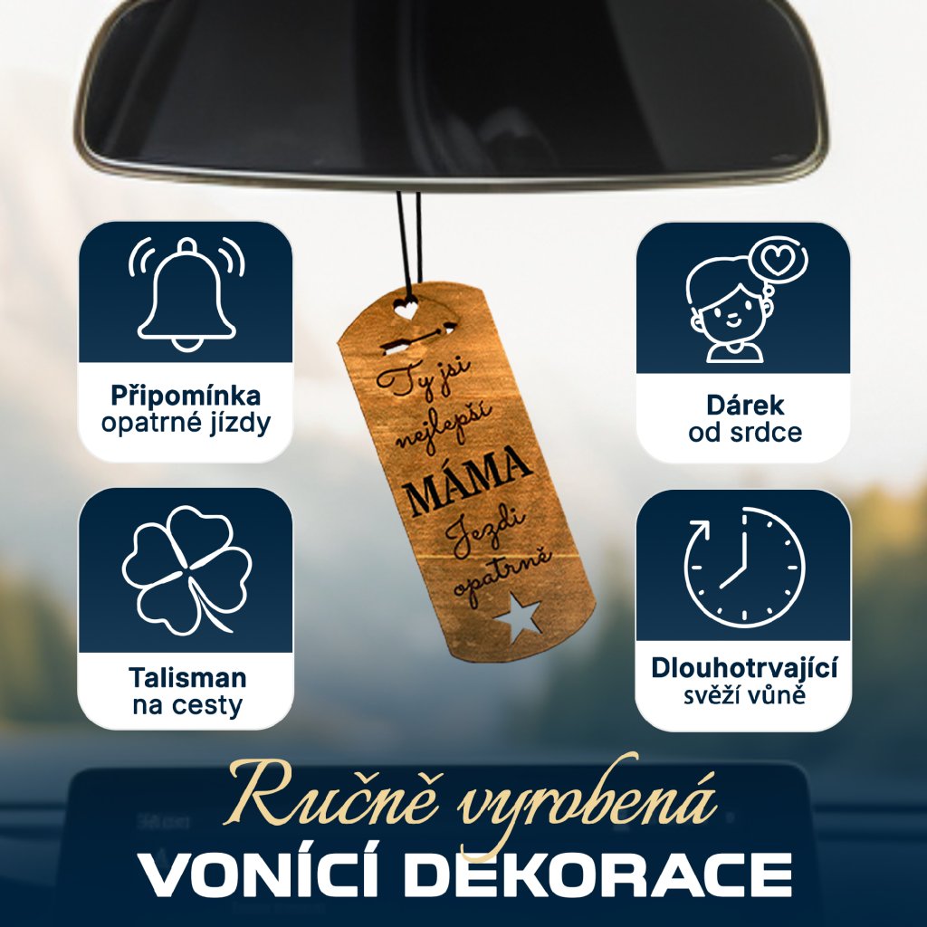 Originální dřevěná vůně s nápisem „Ty jsi nejlepší máma, jezdi opatrně“ zpříjemní každou cestu a připomene, že na ni její děti myslí.
