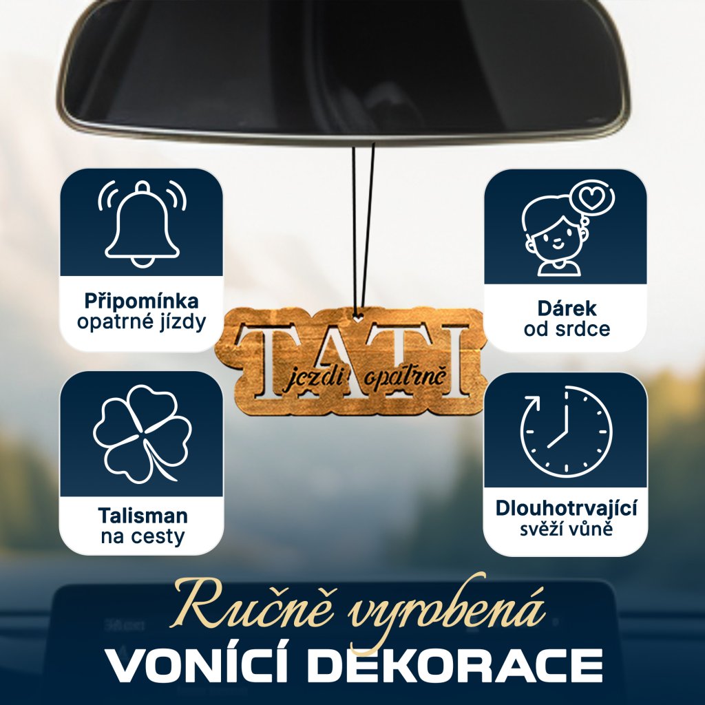 Dřevěná vůně do auta s nápisem „Tati jezdi opatrně“ spojuje praktické využití s osobním významem. Zavěšená na zpětném zrcátku decentně připomíná, že doma na něj někdo čeká.