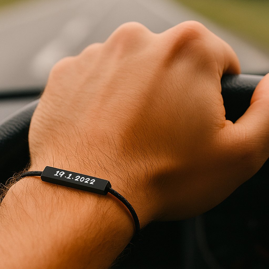 Minimalistický černý náramek na šňůrce, na který si můžete nechat vyrýt vlastní text - jméno, datum nebo jiný nápis podle sebe. Ideální k narozeninám, výročí nebo jako symbolický osobní dárek.