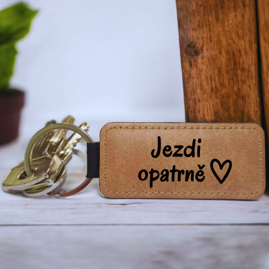 Kožená klíčenka s vygravírovaným vzkazem „Jezdi opatrně“