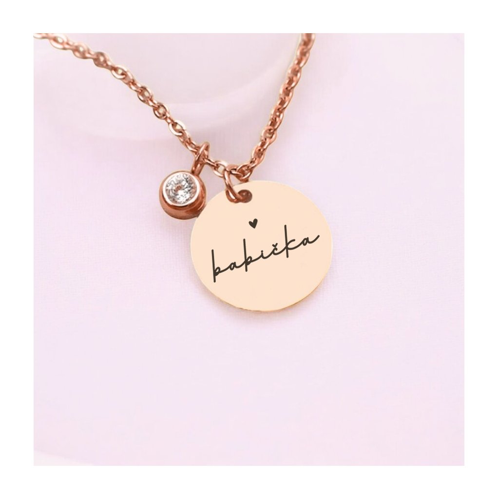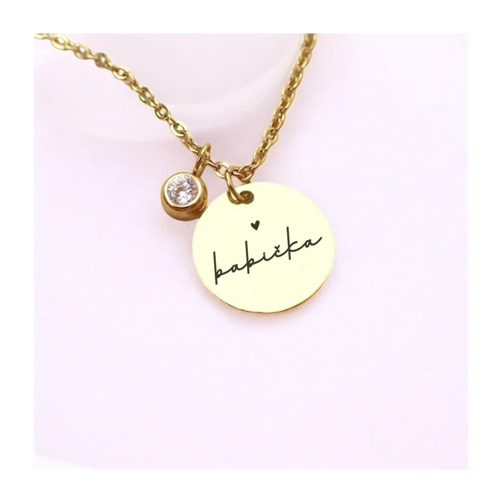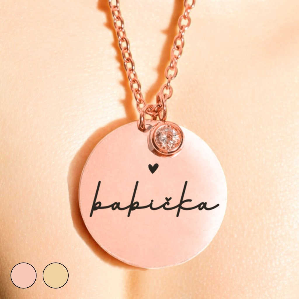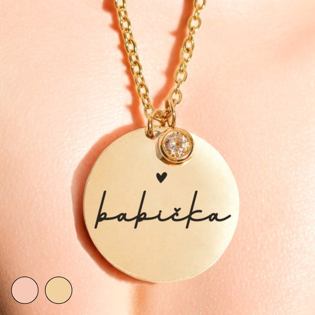 Minimalistický náhrdelník s medailonkem a nápisem „babička“ je dojemným šperkem, který potěší svou jednoduchostí i významem. Třpytivý zirkon dodává jemný lesk a eleganci. Ideální dárek pro babičku k narozeninám, Vánocům nebo jen tak – z lásky.