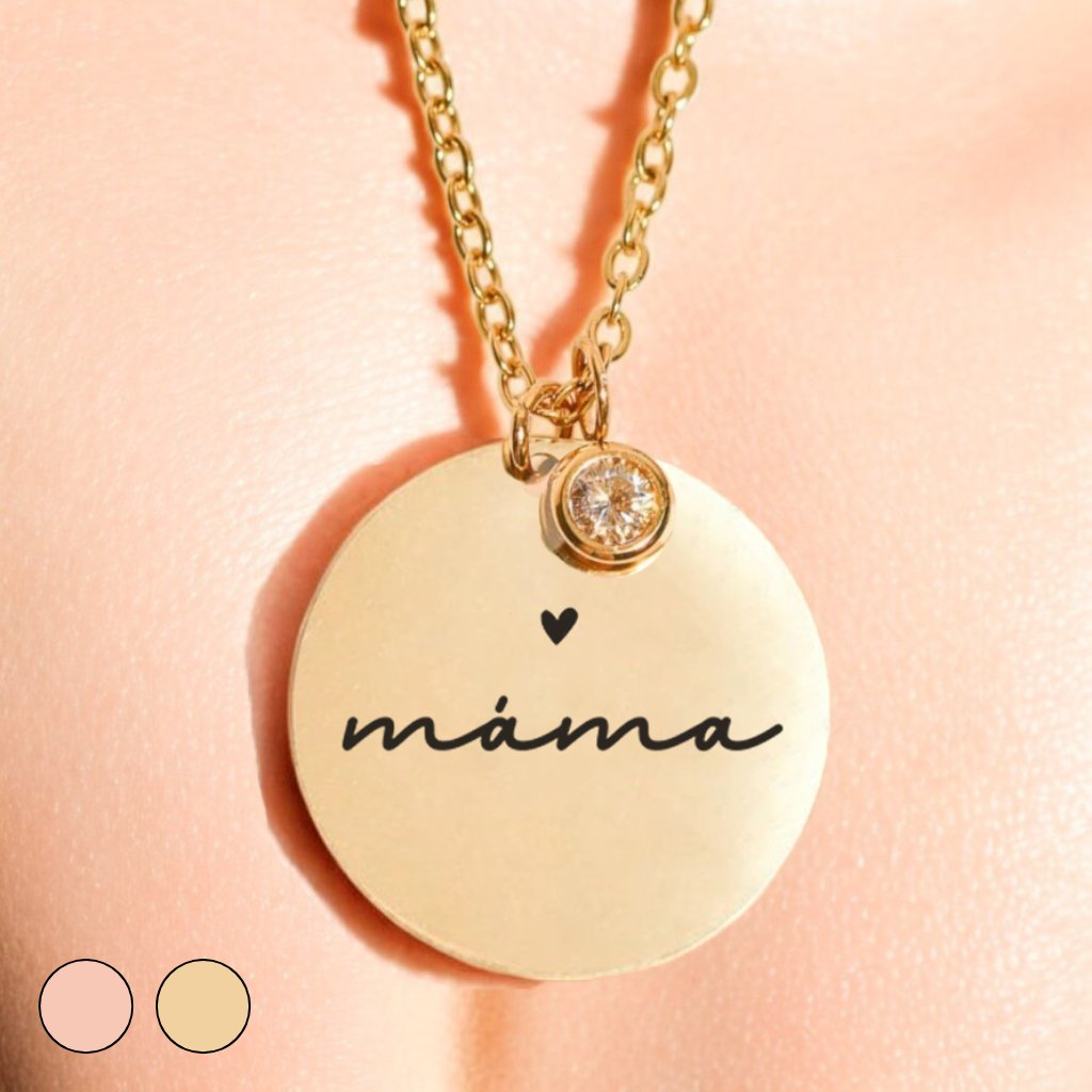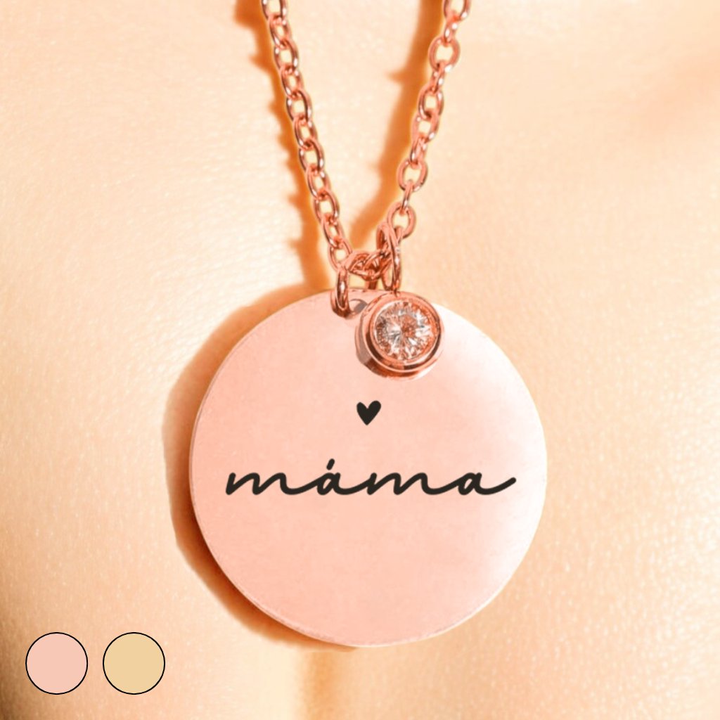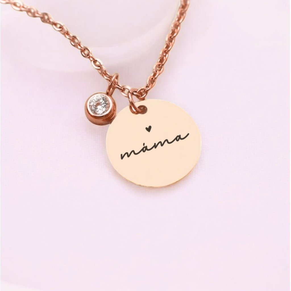 Minimalistický náhrdelník s medailonkem a nápisem „máma“ a se srdíčkem je dojemným šperkem, který potěší svou jednoduchostí i významem. Třpytivý zirkon dodává jemný lesk a eleganci. Ideální dárek pro maminku k narozeninám, Vánocům, Dni matek nebo jen tak – z lásky.