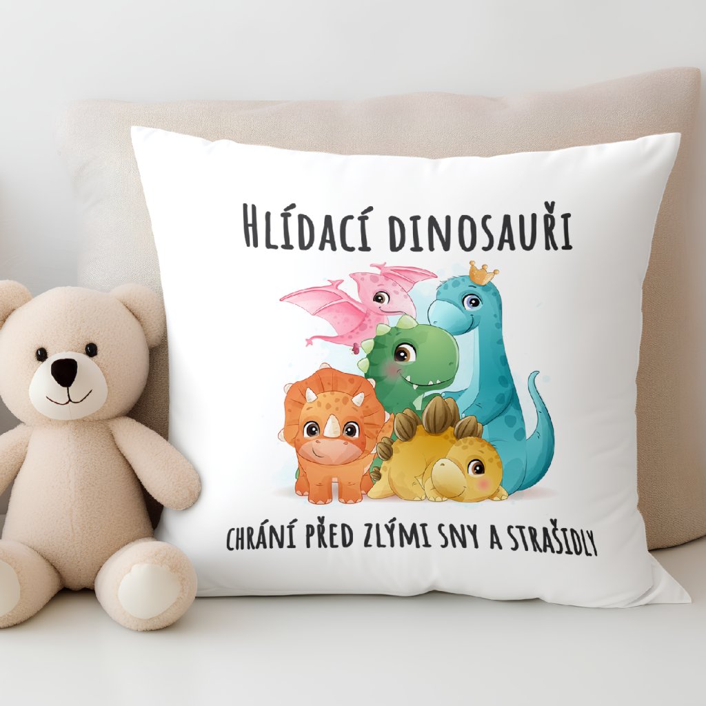 Roztomilý dětský polštář s hlídacími dinosaury a nápisem „Chrání před zlými sny a strašidly“ je ideálním doplňkem do dětského pokoje. Barevný potisk se skupinkou přátelských dinosaurů přináší pocit bezpečí a radosti – perfektní dárek pro kluky i holky, kteří milují zvířátka a potřebují večer klidné usínání.