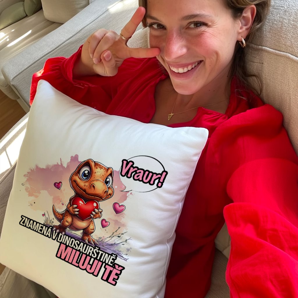 Roztomilý dinosaurus držící srdíčko místo slov řekne: VRAUR!, což v dinosauřtině znamená „Miluji tě“. Ideální polštář k Valentýnu, výročí nebo jen tak – pro někoho, koho máte opravdu rádi.