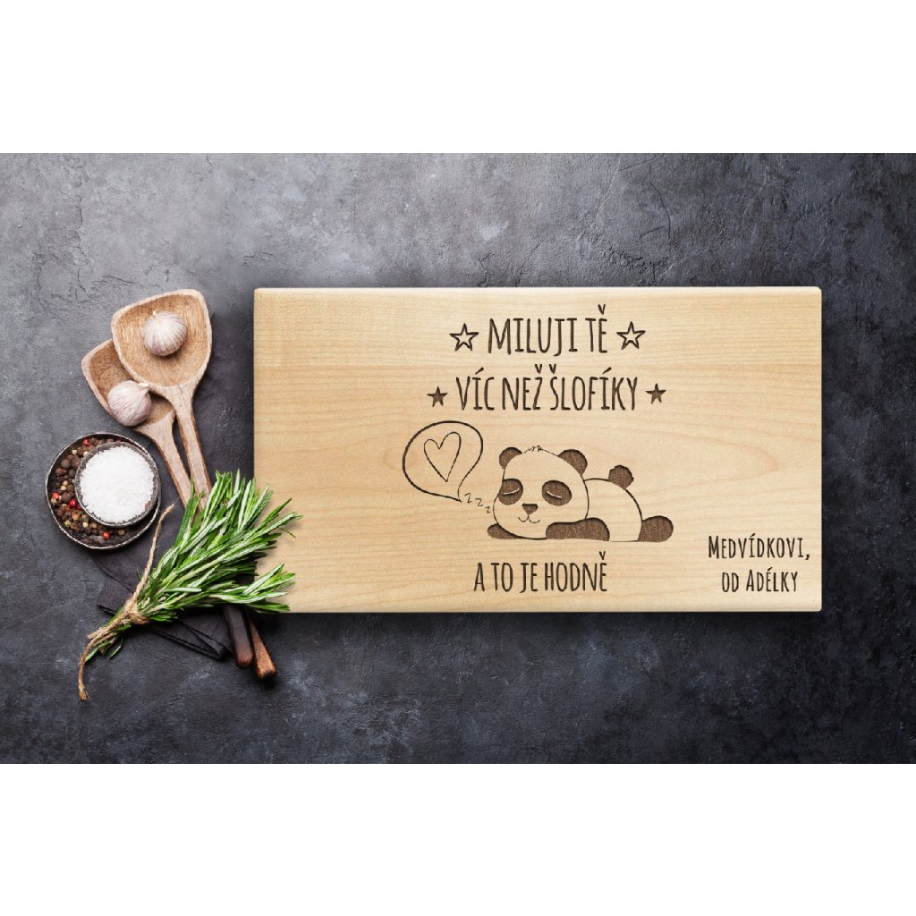 „Miluji tě víc než šlofíky“ – to už je co říct! Roztomilé prkénko s ospalou pandou a gravírovaným věnováním je dokonalý dárek od srdce. Udělá radost všem medvídkům, partnerům i milovníkům kuchyně, kteří ocení vtip a lásku v jednom kousku dřeva.