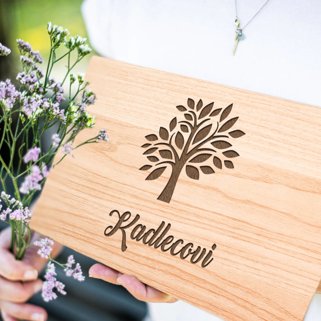 Dřevěné prkénko s jemně gravírovaným stromem a jménem dodá každé slavnostní chvíli osobní rozměr – ať už při svatebním dni, nebo jako milá vzpomínka do domácnosti.