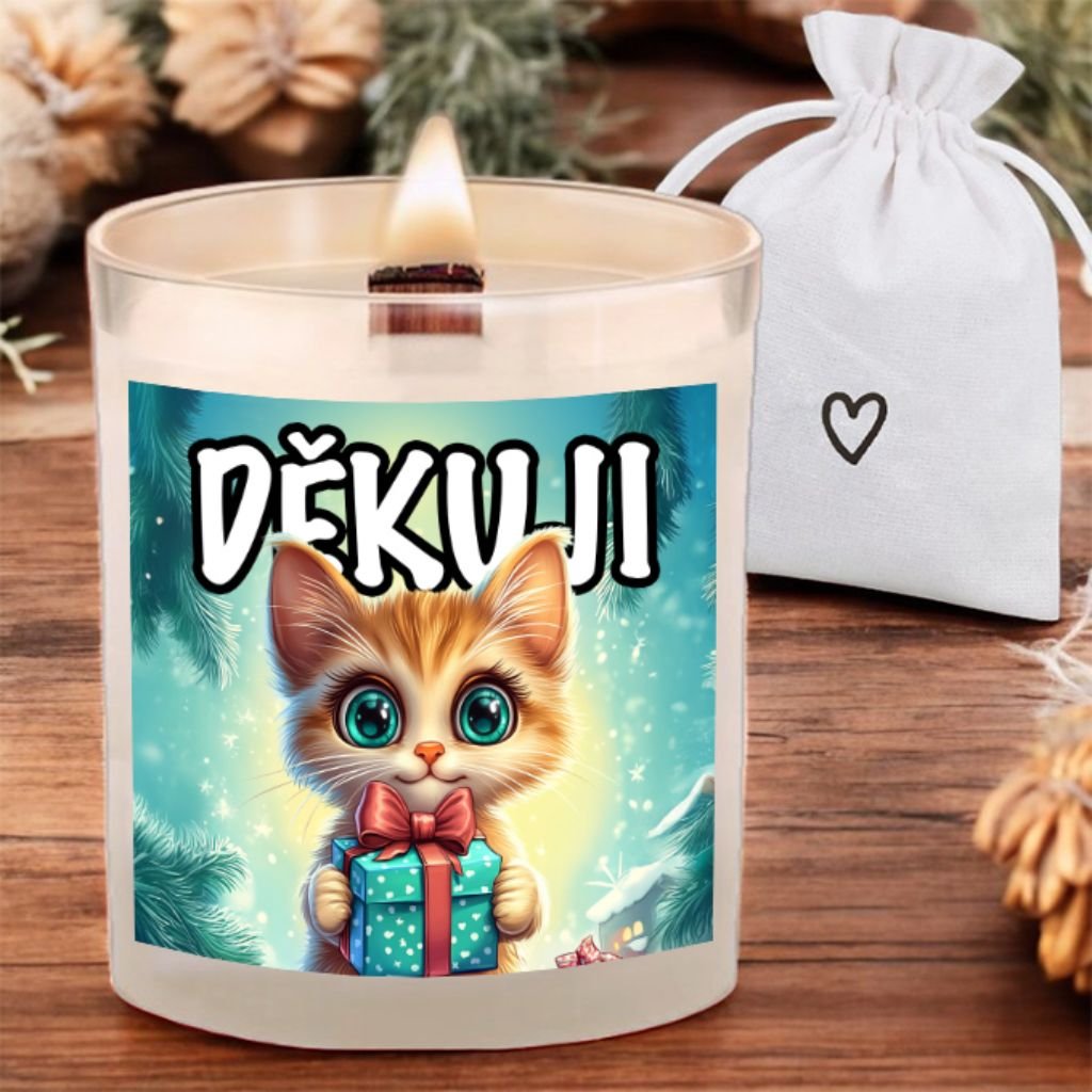 Tato dárková svíčka je vyrobená ze 100% přírodního sójového vosku a provoní prostor jemnou vanilkovou vůní. Dřevěný knot při hoření tiše praská, čímž navodí atmosféru klidu. Roztomilý design s kočkou a nápisem „Děkuji“ funguje i bez dalších slov.